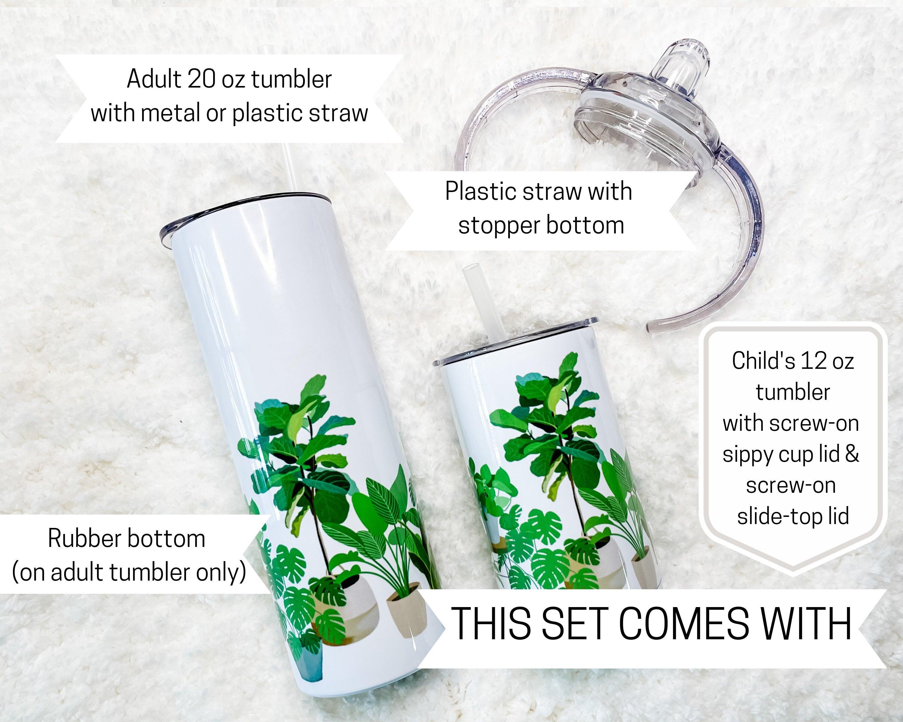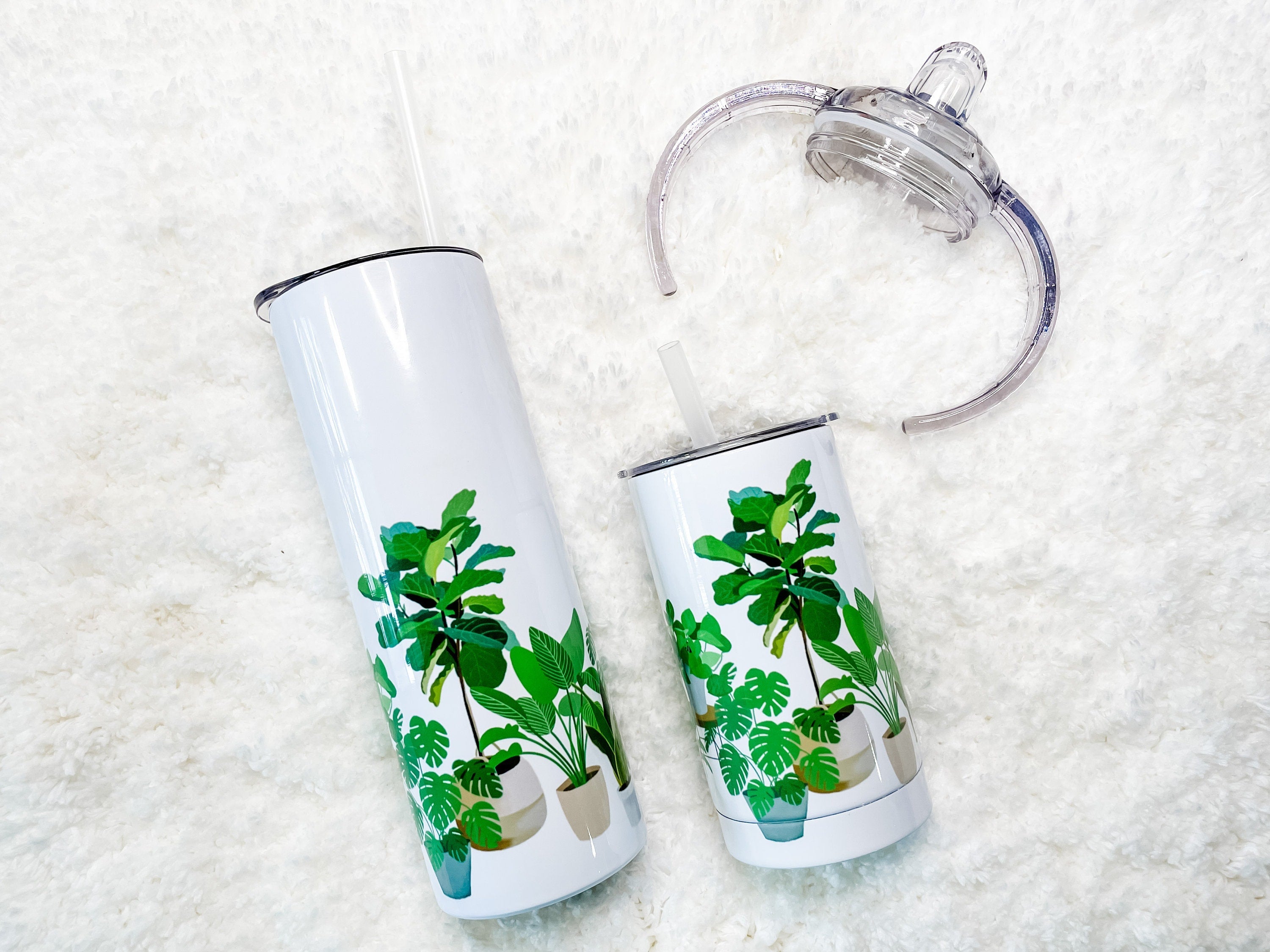 Matching Mama and Baby or Mama and Mini Tumbler set! This Tumbler set features several hand-drawn Plant illustrations; Fiddle Fig, Dieffenbachia, Snake Plant, Monstera, and Pothos. The pattern creates a full-wrap, no-seam design.