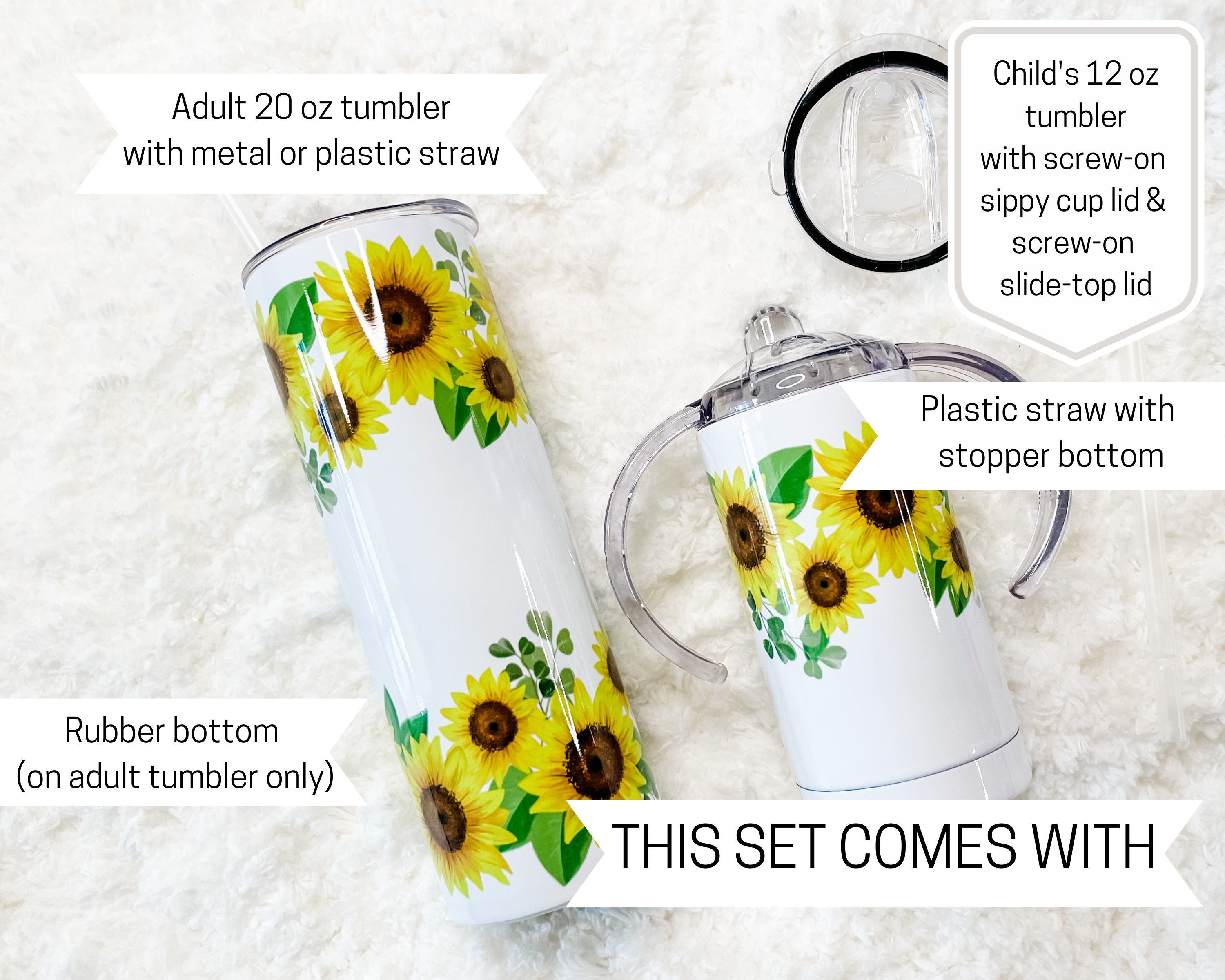 - The small tumbler is 12 oz, double insulated and comes with both a slow-flow sippy cup lid and a slide top lid with a plastic straw with stopper end (to stop the straw from being pulled out from the top). This grows with the child and allows for use for many years!