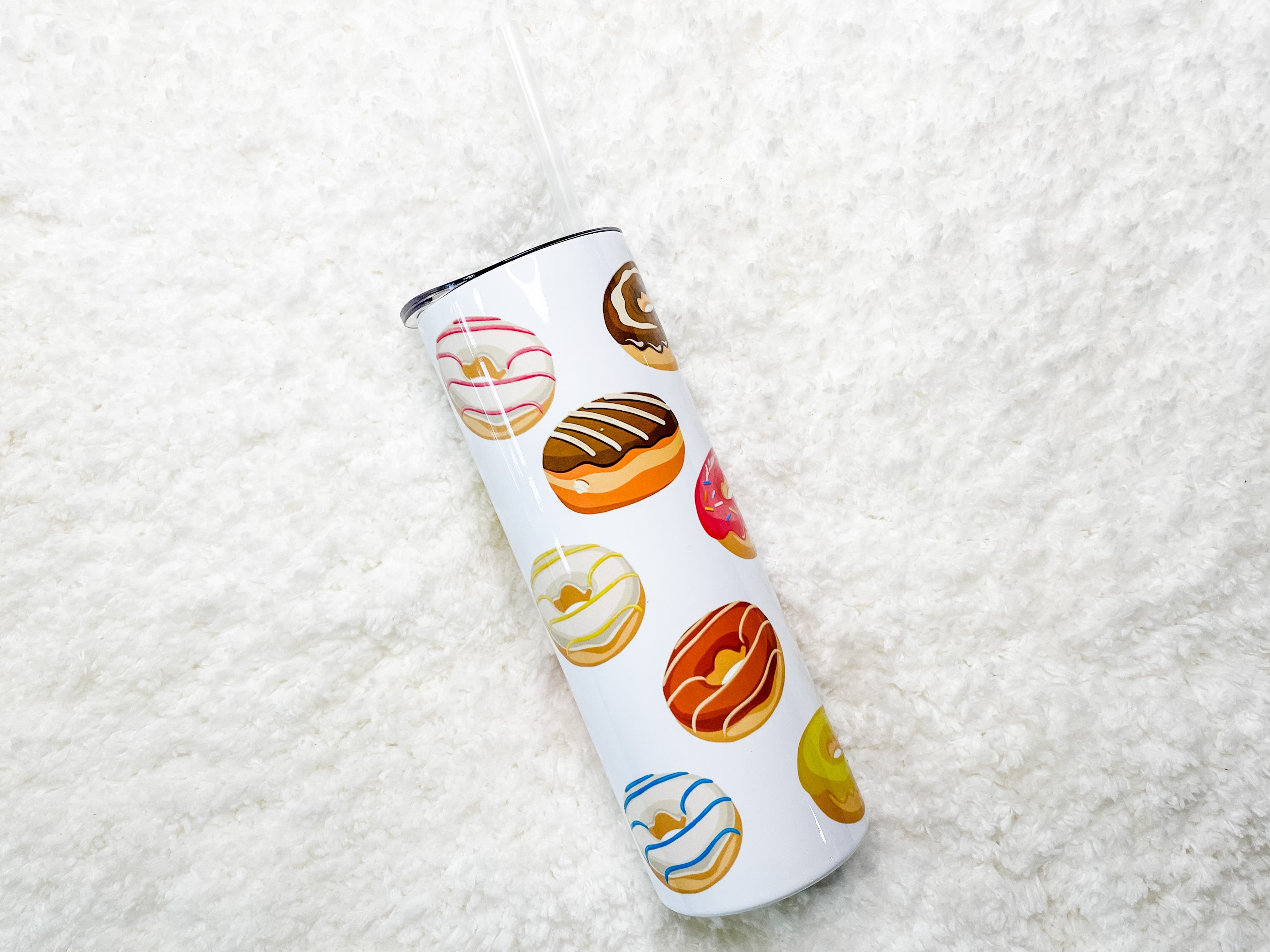 This fun Tumbler features hand-drawn colorful doughnuts. This is original artwork created by the shop owner. The pattern features lots of illustrated doughnuts as a full-wrap, no-seam design.