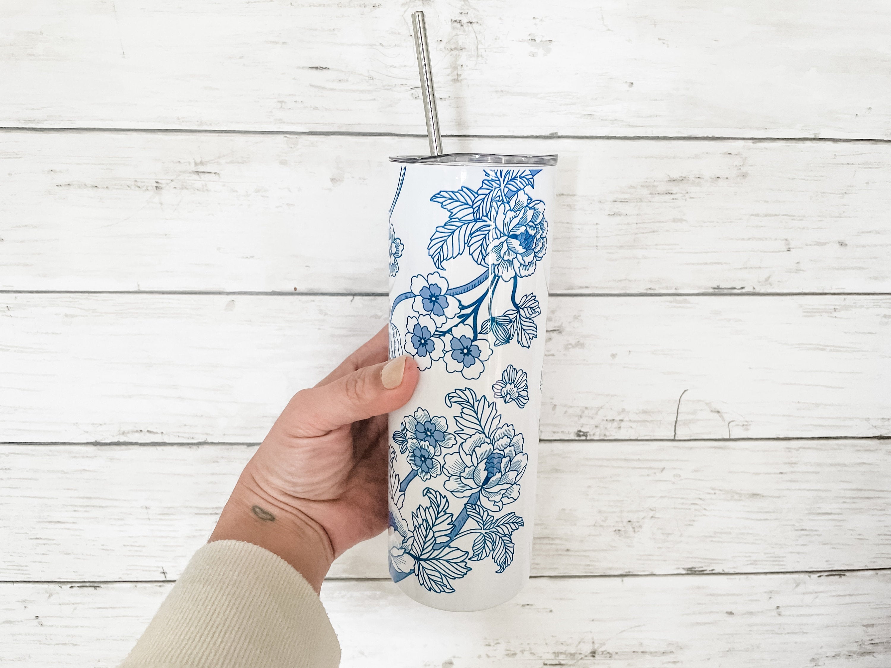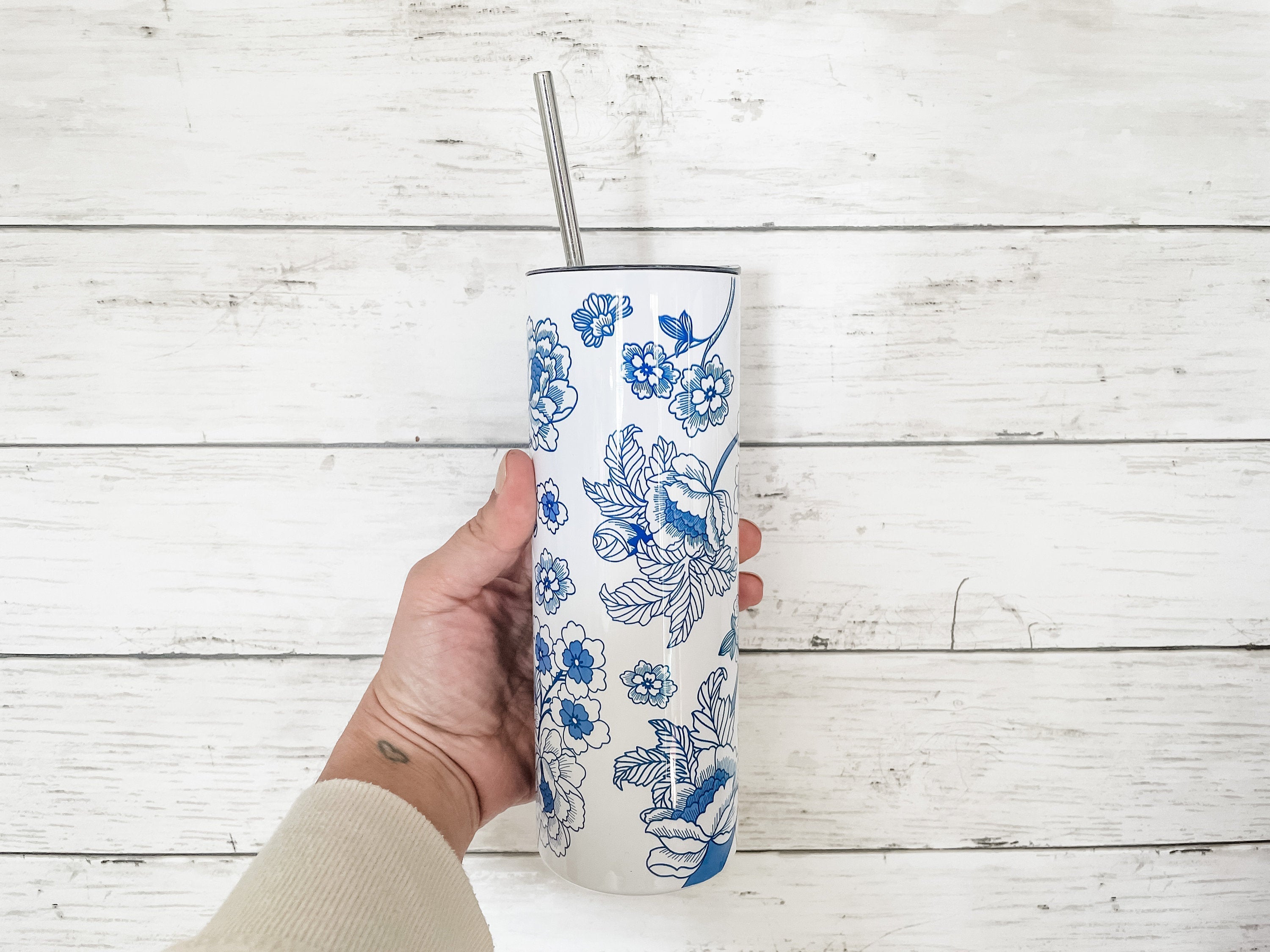 This beautiful blue & white Tumbler features hand-drawn Chinoiserie-style blue and white art. This is original artwork created by the shop owner. The pattern features a leaf and flower branch pattern as a full-wrap, no-seam design.